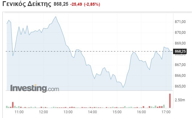 Πιο αναλυτικά, ο Γενικός Δείκτης σημείωσε ισχυρή πτώση κατά 2,85% και κατρακύλησε στις 868,25 μονάδες, χάνοντας 25,5 μονάδες σε σχέση με το κλείσιμο της Παρασκευής (893,74 μονάδες). Το τόξο των ημερήσιων διακυμάνσεων καθορίστηκε σε 23 μονάδες (από 864,41 έως 887,87 μονάδες), με τον τζίρο των συναλλαγών να κυμαίνεται κοντά στα 62 εκατ. ευρώ.