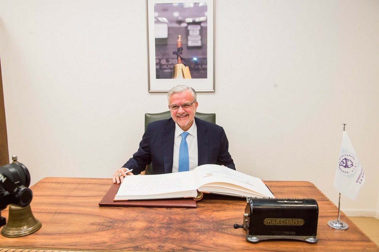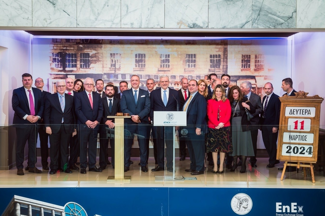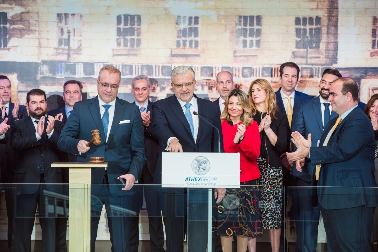 Ο Διευθύνων Σύμβουλος της Πειραιώς Financial Holdings A.E. κ. Χρήστος Μεγάλου και ο Διευθύνων Σύμβουλος του Ταμείου Χρηματοπιστωτικής Σταθερότητας κ. Ηλίας Ξηρουχάκης κήρυξαν την έναρξη της σημερινής συνεδρίασης χτυπώντας το παραδοσιακό καμπανάκι.