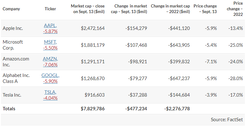 Οι πέντε μεγαλύτερες εταιρείες του S&P 500 από πλευράς κεφαλαιοποίησης έχασαν 477 δισ. δολ. σε αξία, όπως φαίνεται και στον παρακάτω πίνακα: