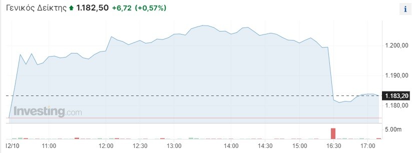 Πιο αναλυτικά, ο Γενικός Δείκτης σημείωσε άνοδο κατά 0,56% και διαμορφώθηκε στις 1.182,31 μονάδες, κερδίζοντας 6,5 μονάδες σε σχέση με το κλείσιμο της Τετάρτης (1.175,78 μονάδες). Το τόξο των ημερήσιων διακυμάνσεων καθορίστηκε σε 27 μονάδες (από 1.179,04 έως 1.206,94 μονάδες), με τον τζίρο των συναλλαγών να κυμαίνεται στα 116 εκατ. ευρώ.