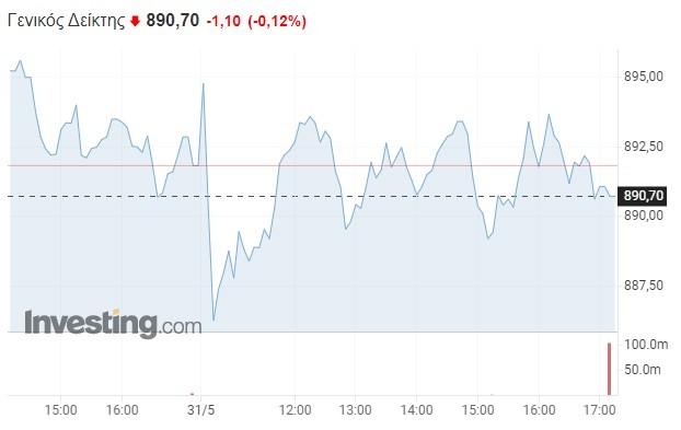 Πιο συγκεκριμένα, αφού ταλαντεύτηκε μεταξύ θετικών και αρνητικών προσήμων, ο Γενικός Δείκτης σημείωσε οριακή πτώση κατά 0,12% και έκλεισε στις 890,70 μονάδες, χάνοντας λίγο περισσότερο από μία μονάδα σε σχέση με το κλείσιμο της Δευτέρας (891,80 μονάδες). Το τόξο των ημερήσιων διακυμάνσεων διαμορφώθηκε σε οκτώ μονάδες (από 886,25 έως 894,74 μονάδες), με τον τζίρο των συναλλαγών να εκτοξεύεται στα 521 εκατομμύρια ευρώ, εκ των οποίων τα 311 εκατ. ευρώ αφορούσαν μόλις δύο μετοχές (ΕΤΕ, Mytilineos).