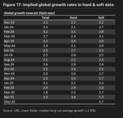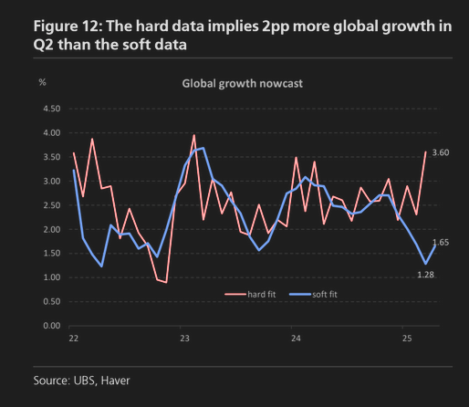Το χάσμα μεταξύ σκληρών και μαλακών δεδομένων αναμένεται επομένως να αρχίσει να μειώνεται, αλλά δεν είναι σαφές εάν αυτό θα βελτιώσει τις εκτιμήσεις των αναλυτών του ελβετικού κολοσσού, καθώς το μεγαλύτερο μέρος της επίδρασης των δασμών δεν έχει ακόμη πραγματοποιηθεί.
