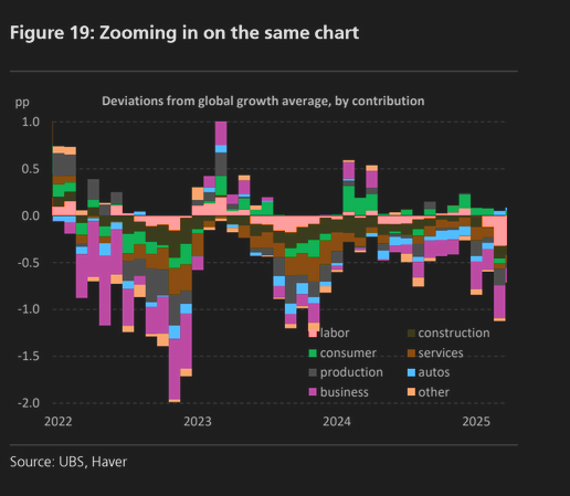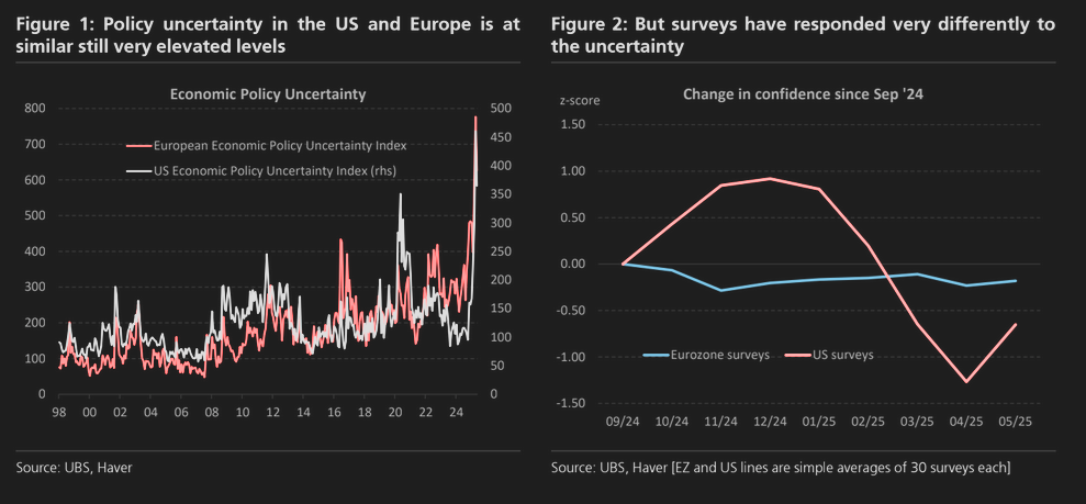 Το χάσμα μεταξύ των σκληρών και των μαλακών δεδομένων είναι ιδιαίτερα σημαντικό στις ΗΠΑ, αλλά οι δείκτες δείχνουν μια διαφορετική εικόνα. Ενώ ο μέσος όρος των σκληρών δεδομένων έχει βελτιωθεί σχεδόν κατά 1 μονάδας τυπικής απόκλισης από την αρχή του έτους, οι προπορευόμενοι δείκτες έχουν επιδεινωθεί κατά 1⁄2 τυπική απόκλιση κατά την ίδια χρονική περίοδο. Οι ρωγμές που εμφανίζονται δεν είναι ακόμη ιδιαίτερα μεγάλες, αλλά σχεδόν όλες οι αυξήσεις των τιμών που προκλήθηκαν από τους δασμούς δεν έχουν ακόμη εμφανιστεί και μαζί με αυτές είναι πιθανή η περαιτέρω εξασθένιση της κατανάλωσης και των επενδύσεων.