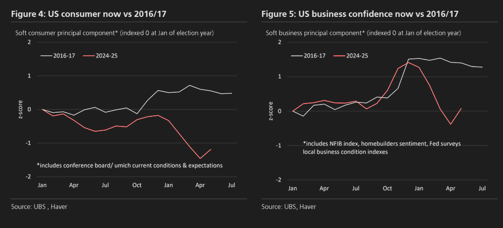 Με την αποκλιμάκωση των δασμών έναντι της Κίνας, τα στοιχεία αυτά ανέκαμψαν στις ΗΠΑ, αλλά παραμένουν περίπου 1 1⁄2 μονάδες τυπικής απόκλισης χαμηλότερα. Για τις επιχειρήσεις, η μείωση της εμπιστοσύνης ήταν σε μεγάλο βαθμό αντιστροφή της ανόδου της αισιοδοξίας του δ’ τριμήνου, ενώ για τους καταναλωτές ήταν μια ευθεία πτώση.