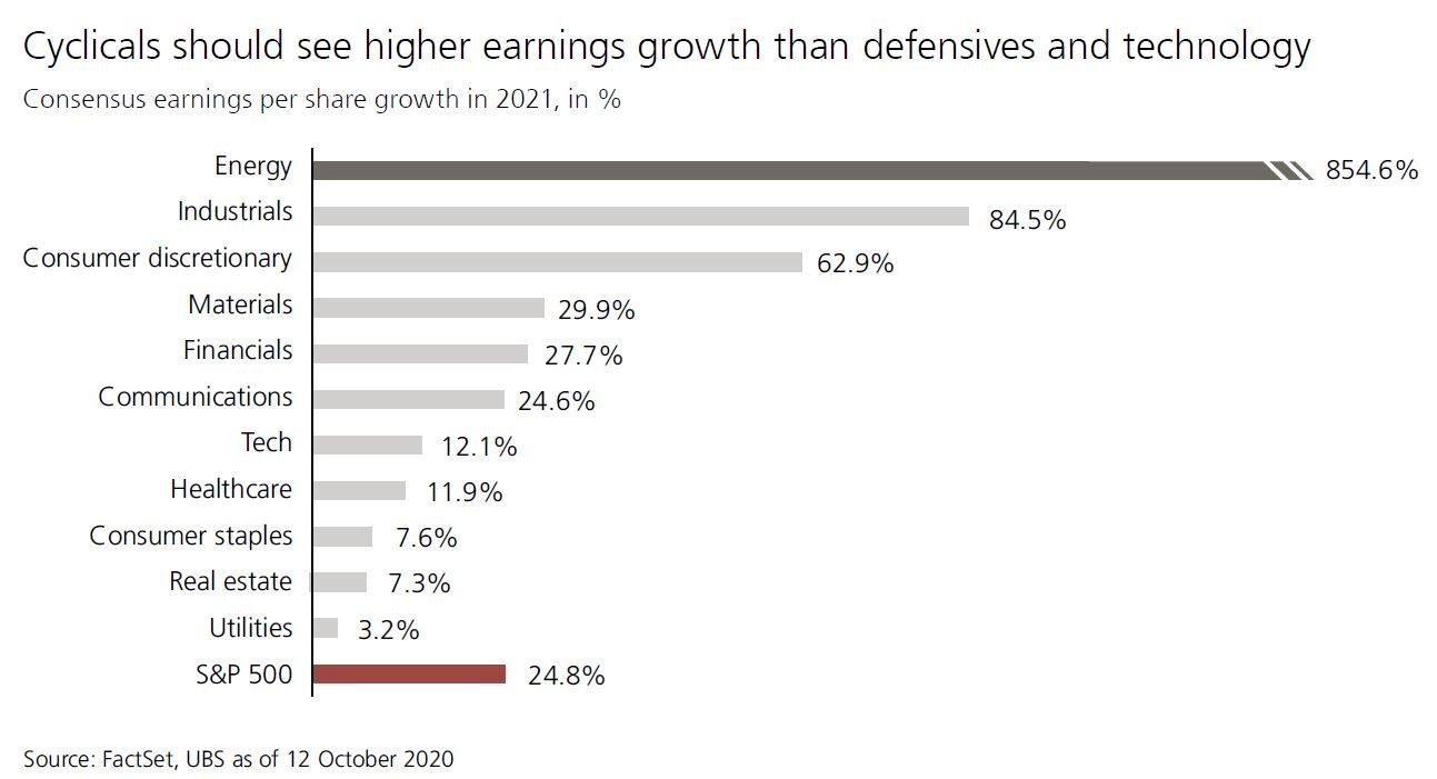 Με βάση τις τρέχουσες προοπτικές, όπως αυτές παρουσιάζονται στην ετήσια έκθεση ‘Year Ahead’ που δημοσιεύθηκε από τη Διεύθυνση Επενδύσεων (Chief Investment Office) της UBS Global Wealth Management και σύμφωνα με ένα βασικό σενάριο, τα δημοσιονομικά κίνητρα σε συνδυασμό με τα συνεχιζόμενα χαμηλά επιτόκια και την κυκλοφορία εμβολίου αναμένεται να δημιουργήσουν αποδόσεις άνω του μέσου όρου για μικρο-μεσαίες επιχειρήσεις, για επιλεγμένες μετοχές του χρηματοοικονομικού και του ενεργειακού κλάδου, καθώς και για εταιρείες στους κλάδους βιομηχανικών προϊόντων και καταναλωτικών αγαθών πολυτελείας.