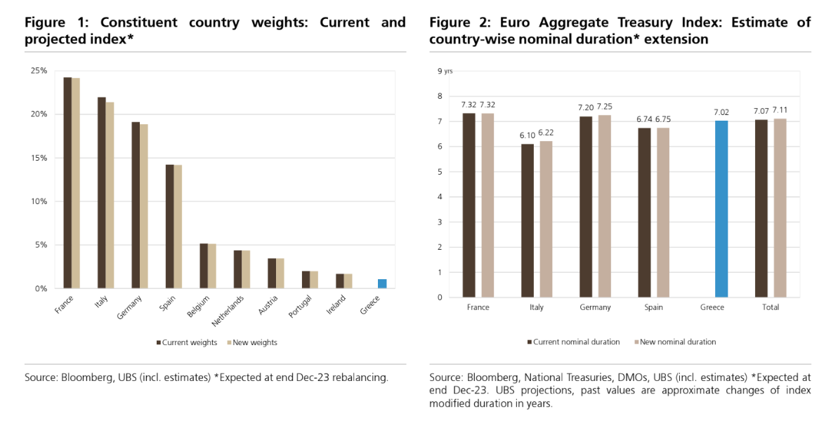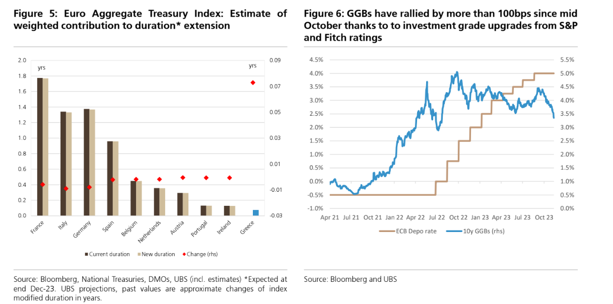 Με την πρόσφατη αναβάθμιση της μακροπρόθεσμης πιστοληπτικής ικανότητας της Ελλάδας από τον οίκο Fitch σε BBB-, μετά από την αναβάθμιση από την S&P τον Οκτώβριο σε BBB-, η Ελλάδα θα επιστρέψει στους κύριους δείκτες της αγοράς ομολόγων το επόμενο έτος. Το ελληνικό δημόσιο χρέος θεωρείται πλέον επενδυτικής βαθμίδας και, ως εκ τούτου, είναι επιλέξιμο για τον εμβληματικό δείκτη Bloomberg Euro Aggregate Treasury Bond Index αλλά και σε άλλους δείκτες αποκλειστικά επενδυτικής βαθμίδας. Πρόκειται για ένα σημαντικό ορόσημο για το ελληνικό χρέος, καθώς πολλοί διεθνείς επενδυτές δημιουργούν τα χαρτοφυλάκια ομολόγων τους με αναφορά αυτόν τον δείκτη και θα μπορούσε να οδηγήσει σε αύξηση της ζήτησης για τα ελληνικά κρατικά ομόλογα.