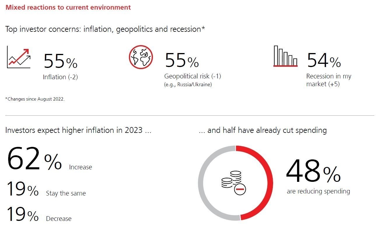 Σύμφωνα με τα διαθέσιμα ευρήματα σε 14 διαφορετικές χώρες, το 54% των επενδυτών εκφράζει ανησυχίες για τον κίνδυνο συρρίκνωσης του ΑΕΠ, ένα ποσοστό αυξημένο κατά πέντε ποσοστιαίες μονάδες σε σχέση με το β’ τρίμηνο του 2022 (49%).