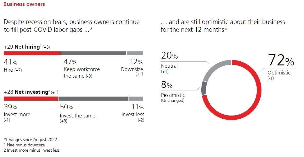 Σε ξεχωριστή έρευνα της UBS, στην οποία συμμετείχαν ιδιοκτήτες επιχειρήσεων και όχι επενδυτές, το 72% δηλώνει αισιόδοξο για την πορεία της εταιρείας του μέσα στους επόμενους 12 μήνες, παρά το γεγονός ότι η ύφεση βρίσκεται στην κορυφή των ανησυχιών. Γι’ αυτό, μάλιστα, το 41% σκοπεύει να συνεχίσει τις προσλήψεις.