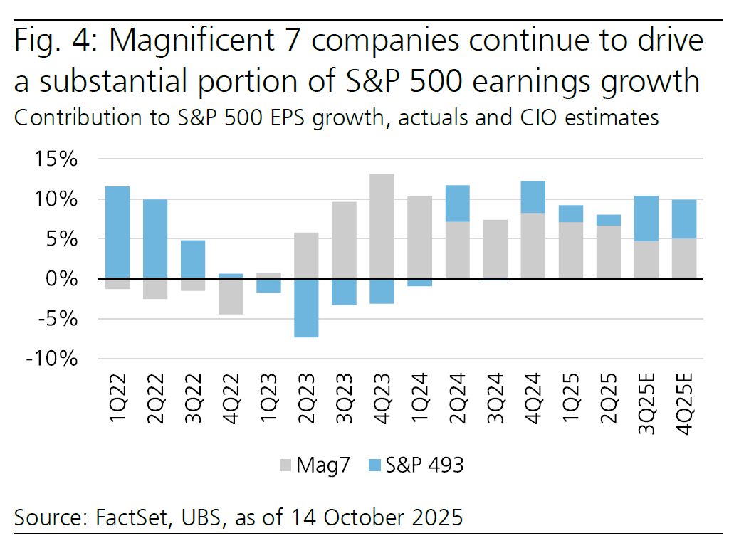 Κεντρικό ρόλο συνεχίζει να διαδραματίζει η ομάδα των λεγόμενων “Magnificent 7”, δηλαδή οι μεγάλες τεχνολογικές εταιρείες που εξακολουθούν να «τραβούν» την κερδοφορία του δείκτη. Για αυτές, η UBS προβλέπει αύξηση κερδών περί το 20% στο τρίτο τρίμηνο, έναντι περίπου 30% στο δεύτερο, επισημαίνοντας ότι η επιβράδυνση είναι φυσιολογική μετά τα εντυπωσιακά αποτελέσματα του πρώτου εξαμήνου. Ωστόσο, ο οίκος εκτιμά πως η εικόνα σταδιακά «διευρύνεται», με σημάδια ανάκαμψης και σε άλλους κλάδους.