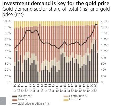 Ο χρυσός κατέγραψε υψηλό ρεκόρ στα 2.075 δολ/ουγγιά την περσινή χρονιά, ωστόσο η συλλογική ζήτηση υποχώρησε κατά 14% σε ετήσια βάση στους 3.759,6 τόνους – που είναι το χαμηλότερο επίπεδο μέσα σε 11 χρόνια. Αν και αυτό εξέπληξε κάποιους, η UBS θεωρεί ότι αποδεικνύει ότι οι επενδυτικές ροές είναι αυτές που καθορίζουν τις τιμές, όχι η ζήτηση από κοσμηματοπωλεία ή κεντρικές τράπεζες. Η ζήτηση από κοσμηματοπώλες υποχώρησε κατά 34% σε ετήσια βάση στο ιστορικό χαμηλό των 1.411,6 τόνων, ενώ οι αγορές από κεντρικές τράπεζες, αν και κινήθηκαν σε θετικό πρόσημο για 11ο συνεχόμενο έτος, υποχώρησαν κατά 59% ετησίως στους 273 τόνους.