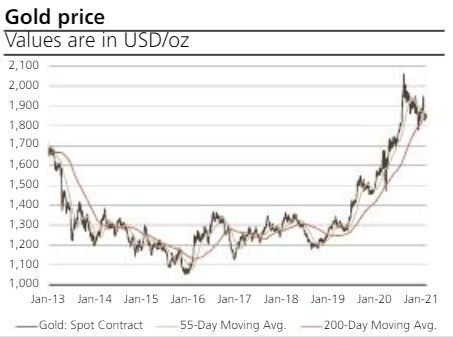 Η τράπεζα εκτιμά ότι οι τιμές του χρυσού θα αυξηθούν πάνω από τα 1.900 δολ/ουγγιά κατά το α’ εξάμηνο του 2021 πριν υποχωρήσουν στα 1.800 δολ/ουγγιά στις αρχές του 2022. Αν και οι προβλέψεις μας δείχνουν περιορισμένη ανοδική κίνηση για τον χρυσό, παραμένει ισχυρός ο στρατηγικός του ρόλος για ένα χαρτοφυλάκιο, καταλήγει το σημείωμα της UBS.