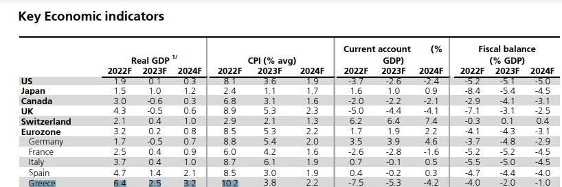 Η UBS εκτιμά ότι το επιτόκιο της Ευρωπαϊκής Κεντρικής Τράπεζας θα διαμορφωθεί σε 2,75% το 2023 και 2,5% το 2024 και προβλέπει ιστορικά αδύναμες προοπτικές, με παγκόσμια ανάπτυξη 2,1% ετησίως το 2023, την πιο αδύναμη ανάπτυξη από το 1993, εκτός της πανδημίας. Αν και το μεγαλύτερο μέρος της αδυναμίας σε σύγκριση με την τάση προέρχεται από τις ΗΠΑ (για τις οποίες προβλέπεται ύφεση) και την Κίνα, αναμένει ότι 13 από τις 32 οικονομίες θα συρρικνωθούν για τουλάχιστον δύο τρίμηνα μέχρι το τέλος του 2023.