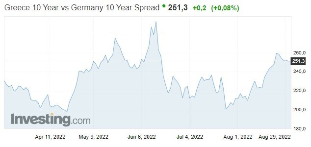 Σ’ όλα αυτά, θα πρέπει να προστεθεί και ο αυξημένος πολιτικός κίνδυνος στις δύο πιο ευάλωτες χώρες του ευρώ, δηλαδή την Ιταλία και την Ελλάδα. Η γειτονική χώρα έχει εκλογές στις 25 Σεπτεμβρίου, με τον λαϊκιστικό συνασπισμό της Τζόρτζια Μελόνι να αποτελεί το μεγάλο φαβορί.
