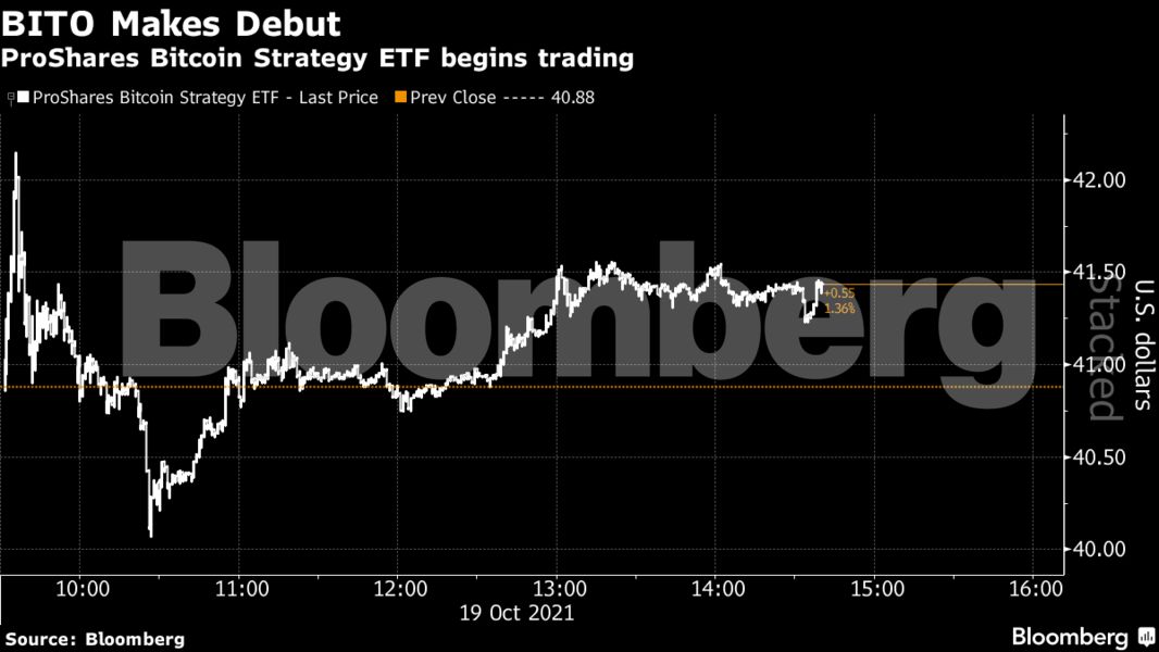 Tο «BITO» -όπως ονομάζεται το αμοιβαίο κεφάλαιο που συνδέεται με το δημοφιλές κρυπτονόμισμα- κατέγραψε κέρδη πάνω 4,5% στα 41,94 δολάρια, ενώ αξίζει να σημειωθεί πως περισσότερες από 24 εκατομμύρια μετοχές άλλαξαν χέρια κατά την πρώτη ημέρα της διαπραγμάτευσης του ProShares Bitcoin Strategy ETF στην αγορά.