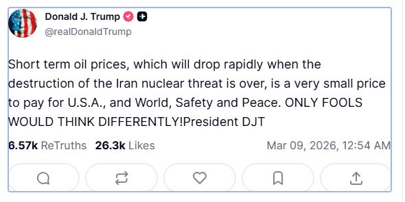 Παρά τις αναταράξεις στις αγορές, ο Πρόεδρος των Ηνωμένων Πολιτειών, Ντόναλντ Τραμπ, δήλωσε ότι η άνοδος των τιμών του πετρελαίου βραχυπρόθεσμα αποτελεί «πολύ μικρό τίμημα» για την εξουδετέρωση της πυρηνικής απειλής του Ιράν.