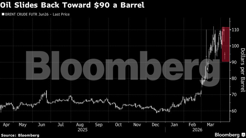 Το Brent κατέγραψε πτώση έως και 16% πριν σταθεροποιηθεί κοντά στα 95 δολάρια το βαρέλι, ενώ το αμερικανικό West Texas Intermediate σημείωσε τη μεγαλύτερη πτώση των τελευταίων σχεδόν έξι ετών, υποχωρώντας περίπου στα 96 δολάρια.