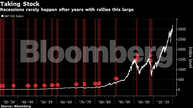 Από το 1930, έχουν περάσει 17 έτη κατά τα οποία ο S&P 500 κέρδισε 25% ή περισσότερο. Ύφεση ακολούθησε μόνο τρεις φορές – το 1990, το 1981 και το 1937. Από την άλλη, οι οικονομολόγοι που ερωτήθηκαν από το Bloomberg τοποθετούν τις πιθανότητες ύφεσης τους επόμενους 12 μήνες στο 30%.