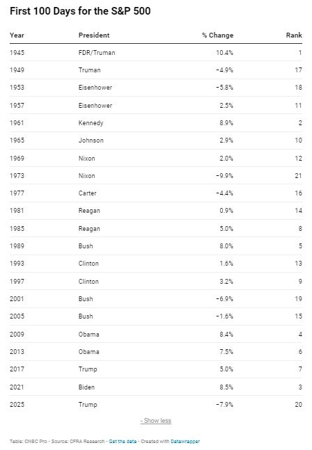 Ο δείκτης S&P 500 μετρά πτώση ύψους 7,9% από τις 20 Ιανουαρίου, ήτοι την ημέρα της ορκωμοσίας, έως και τις 25 Απριλίου, καταγράφοντας έτσι τη δεύτερη χειρότερη επίδοση πρώτων 100 ημερών από την έναρξη της δεύτερης θητείας του Ρίτσαρντ Νίξον, σύμφωνα με δημοσίευμα του CNBC που επικαλείται στοιχεία της CFRA Research.