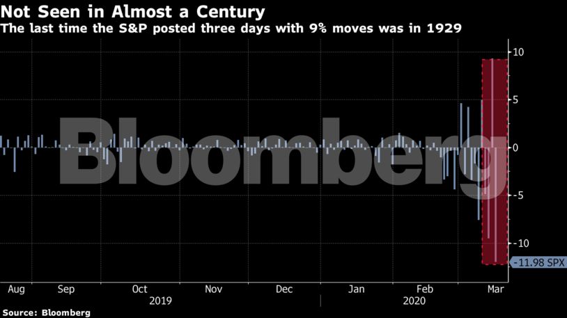 Την τελευταία φορά που ο δείκτης παρουσίασε τέτοιες διακυμάνσεις για τρεις διαδοχικές συνεδρίες ήταν κατά τη διάρκεια της Μεγάλης Ύφεσης: ο δείκτης είχε υποχωρήσει 13% τη Δευτέρα 28 Οκτωβρίου 1929, σημείωσε νέες απώλειες 10% την επόμενη μέρα και στη συνέχεια ενισχύθηκε κατά 13% την Τετάρτη 30 Οκτωβρίου 1929.