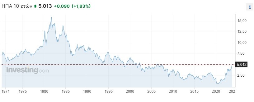 Το ψυχολογικό όριο του 5%, για πρώτη φορά από το 2007, ξεπέρασε η απόδοση του 10ετούς κρατικού ομολόγου στις ΗΠΑ, ενόσω εδραιώνεται η πεποίθηση ότι αφενός η Federal Reserve θα διατηρήσει τα επιτόκια σε υψηλά επίπεδα, αφετέρου η ομοσπονδιακή κυβέρνηση θα αυξήσει τις ομολογιακές εκδόσεις για να χρηματοδοτήσει τα διογκούμενα ελλείμματα.