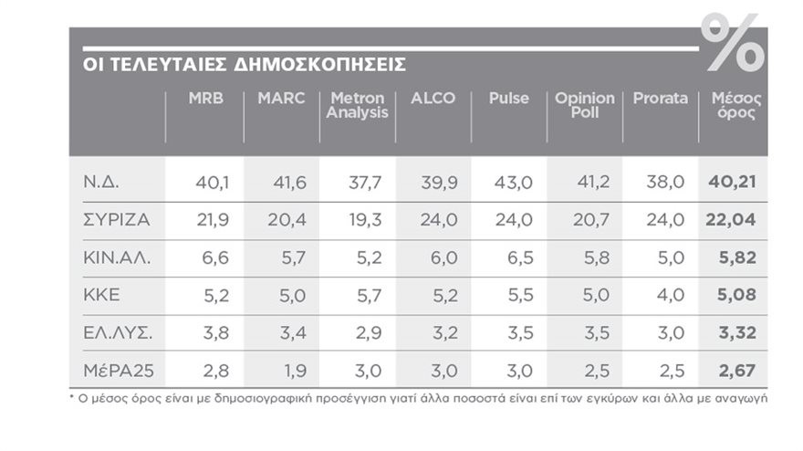 Αυτές τις μέρες βλέπουν το φως της δημοσιότητας οι τελευταίες, πριν τα μπάνια του λαού, δημοσκοπήσεις. Νέες μετρήσεις θα έχουμε παραμονές της ΔΕΘ. Εάν δεν υπάρξουν δραματικά γεγονότα ή απρόβλεπτες εξελίξεις, τα ευρήματα των τελευταίων έξι μηνών θα επαναληφθούν και τον Σεπτέμβριο.