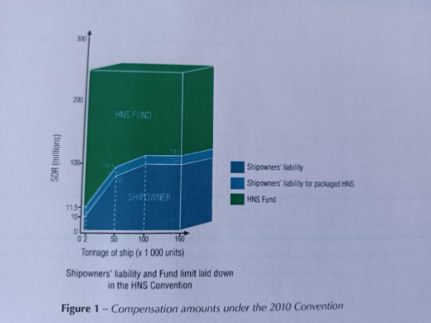 Σύμφωνα με την HNSC, ο πλοιοκτήτης (και ο ασφαλιστής του συνήθως τα p&i clubs) είναι αντικειμενικά υπεύθυνος, (δηλαδή, χωρίς την ανάγκη για τον ζημιωθέντα να αποδείξει την υπαιτιότητα του πλοιοκτήτη), να αποζημιώσει την απώλεια ή τη ζημιά έως ένα ποσό (πρώτο επίπεδο αποζημίωσης): όταν η ζημία προκαλείται από ουσία HNS που μεταφέρεται χύδην, η ευθύνη ανέρχεται σε ποσό μεταξύ 10 και 100 εκατομμυρίων Ειδικών Τραβηκτικών Δικαιωμάτων (ΕΤΔ) του Διεθνούς Νομισματικού Ταμείου (περίπου 15 εκατομμύρια δολάρια ΗΠΑ έως 150 εκατομμύρια δολάρια ΗΠΑ), ανάλογα με την ολική χωρητικότητα του πλοίου· όταν η ζημία προκαλείται από ουσία HNS που μεταφέρεται συσκευασμένη, η μέγιστη ευθύνη για τον πλοιοκτήτη ανέρχεται σε 115 εκατομμύρια ΕΤΔ (περίπου 175 εκατομμύρια δολάρια ΗΠΑ). O ζημιωθείς έχει ευθεία αξίωση και μπορεί να στραφεί κατά του ασφαλιστή του πλοιοκτήτη. Το Διεθνές Κεφάλαιο HNS (Fund) θα παρέχει πρόσθετη αποζημίωση (δεύτερο επίπεδο αποζημίωσης) έως 250 εκατομμύρια ΕΤΔ κατά ανώτατο όριο (περίπου 380 εκατομμύρια Δολάρια) συμπεριλαμβανομένου οποιουδήποτε ποσού καταβάλλεται από τον πλοιοκτήτη και τον ασφαλιστή του. Tο HNS Fund καταβάλλει αποζημίωση όταν το σύνολο των αποδεκτών αξιώσεων υπερβαίνει την ποσοτική ευθύνη του πλοιοκτήτη, καθώς επίσης και όταν ο πλοιοκτήτης απαλλάσσεται της ευθύνης, ή βρίσκεται σε οικονομική αδυναμία.