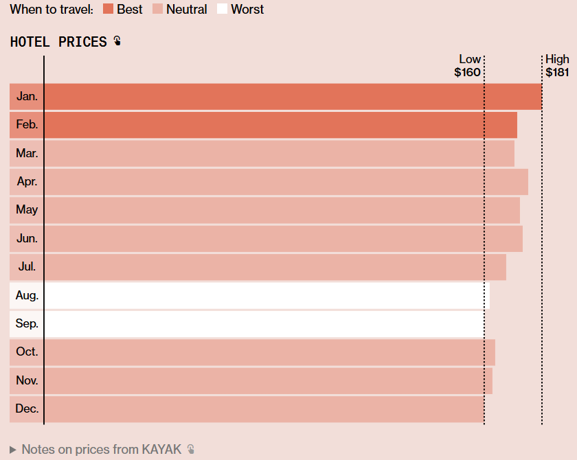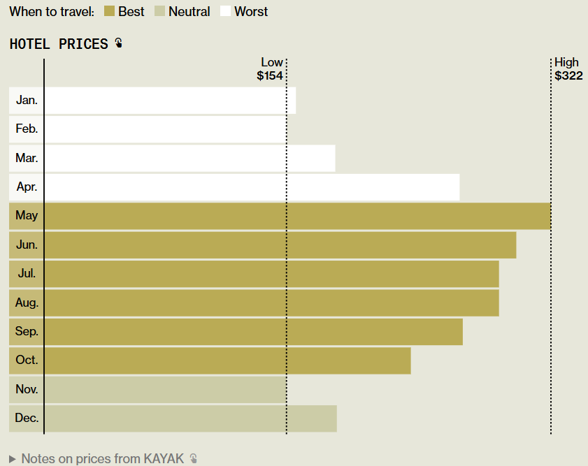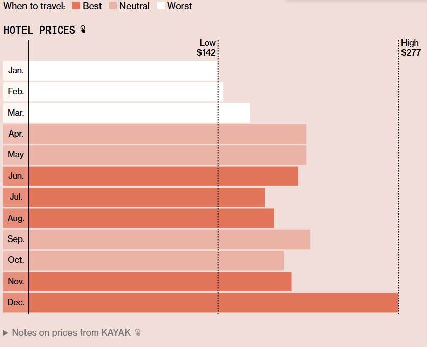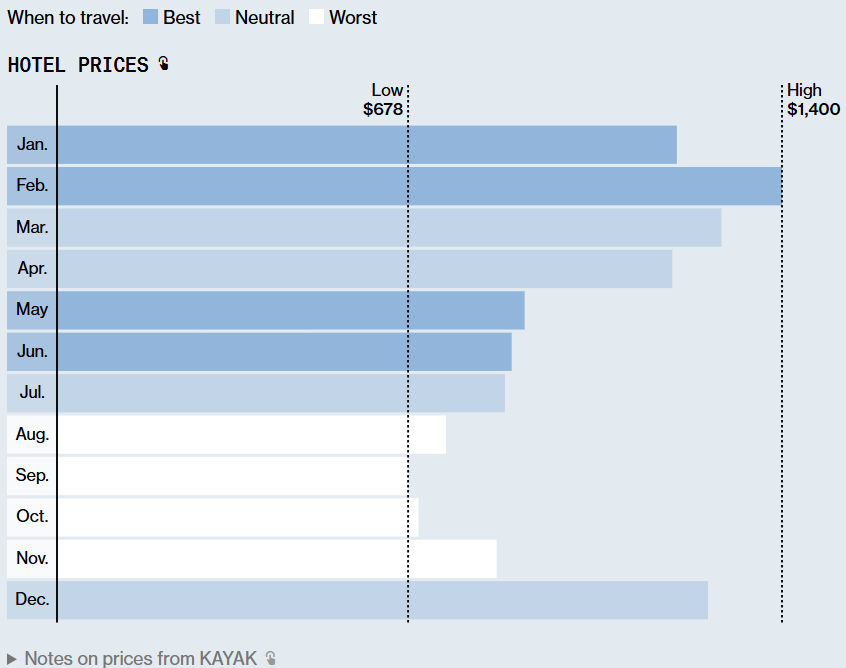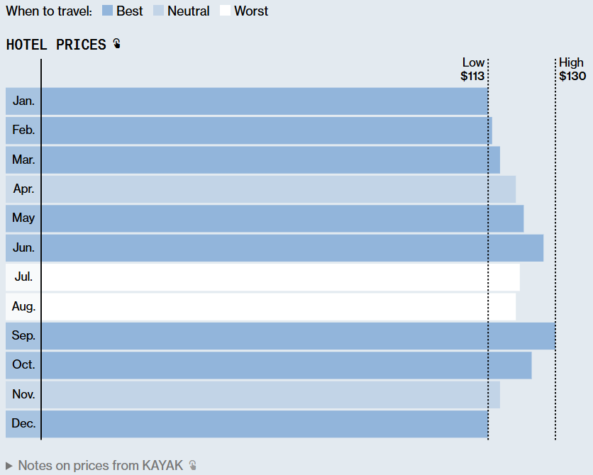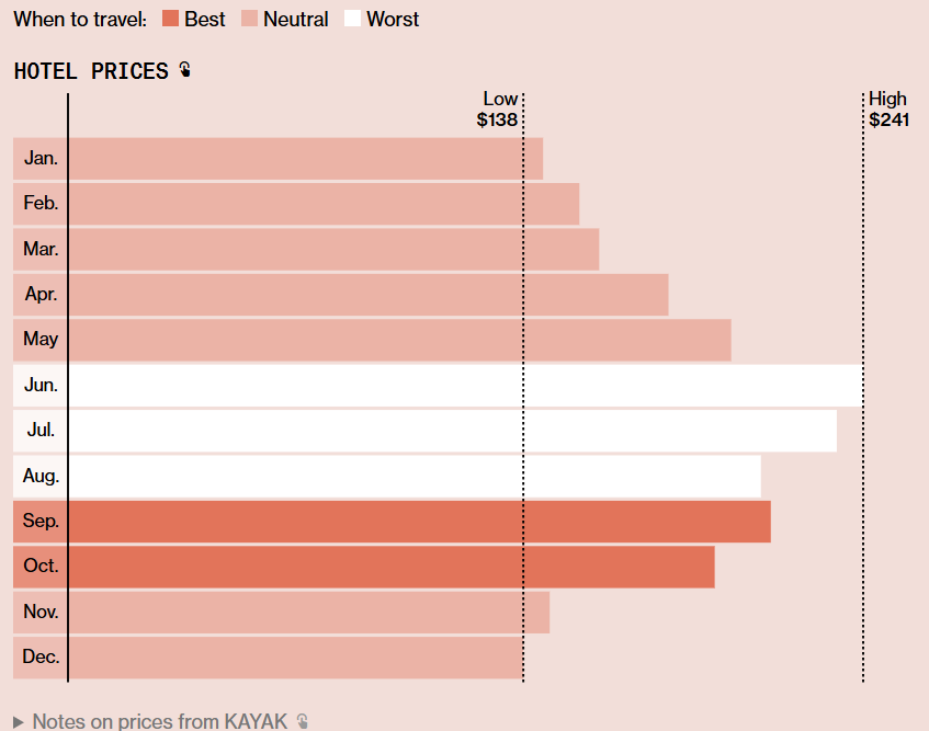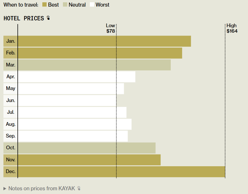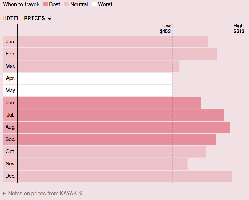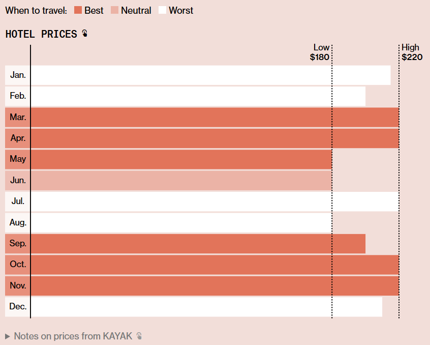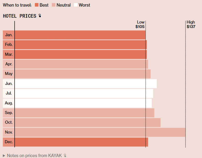 Ακολουθεί η λίστα με τους 25 προορισμούς που αξίζει να επισκεφθείτε το 2026, μαζί με γραφήματα με τις τιμές των καταλυμμάτων καθ’ όλη τη διάρκεια του χρόνου: