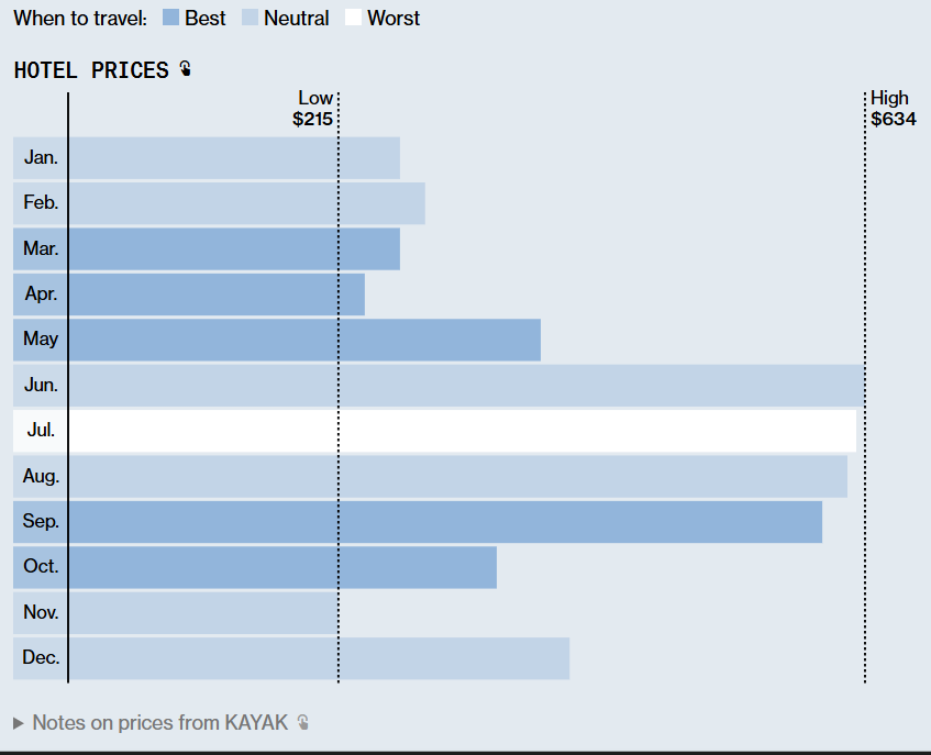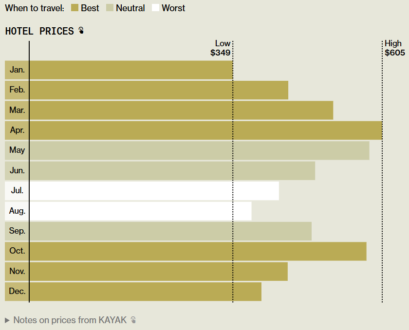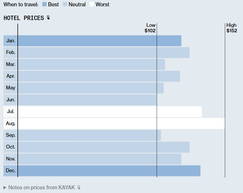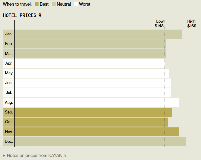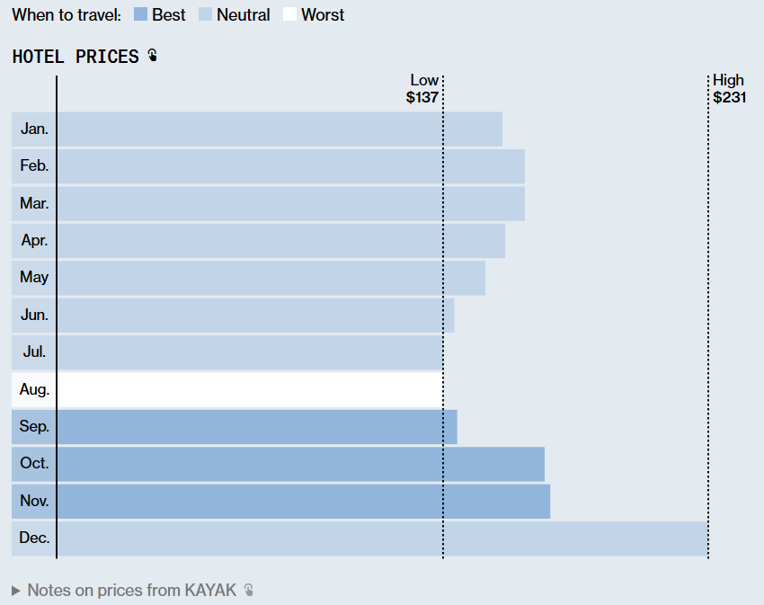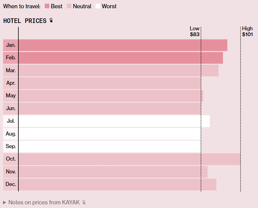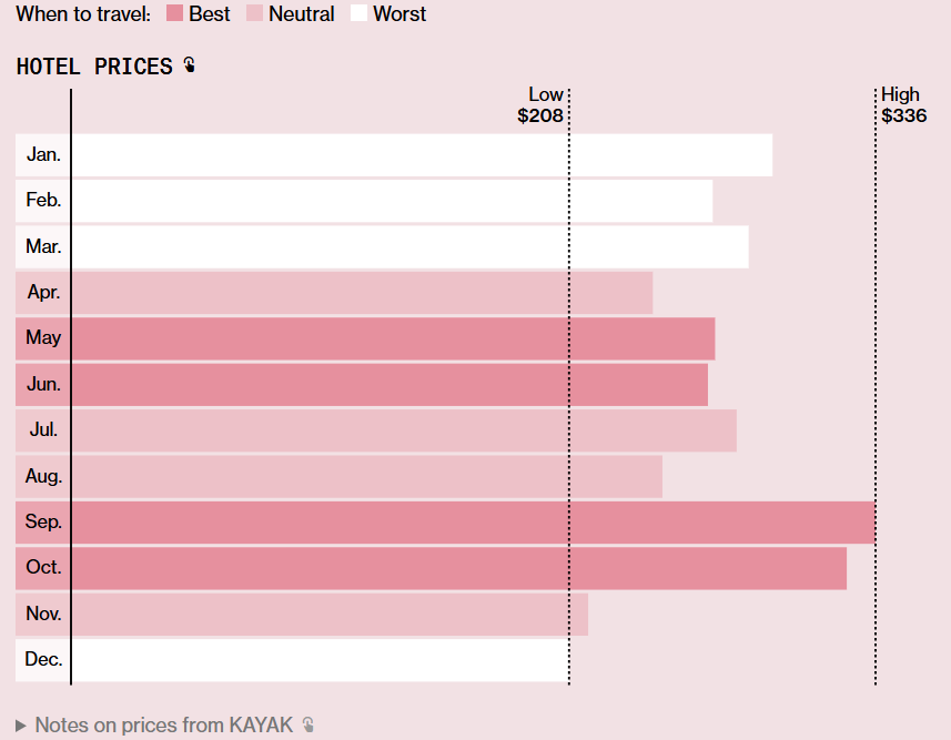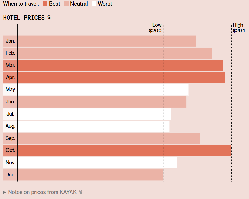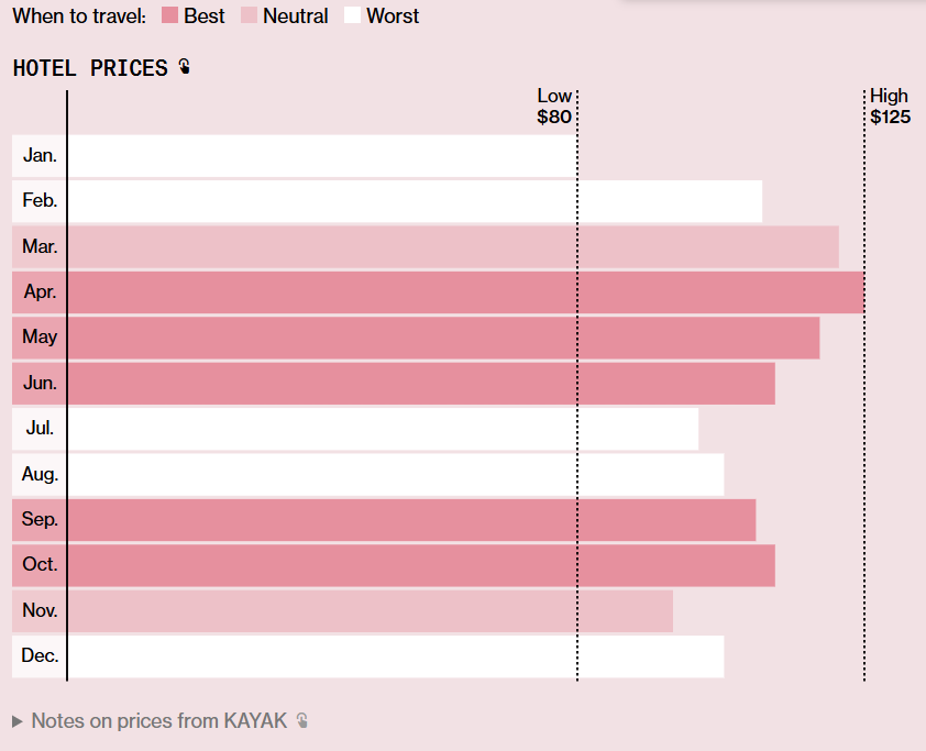 Ακολουθεί η λίστα με τους 25 προορισμούς που αξίζει να επισκεφθείτε το 2026, μαζί με γραφήματα με τις τιμές των καταλυμμάτων καθ’ όλη τη διάρκεια του χρόνου: