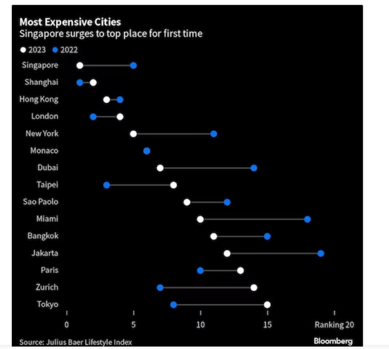 Ο δείκτης Lifestyle του Julius Baer κατατάσσει τις 25 πιο ακριβές πόλεις του κόσμου αναλύοντας κατοικίες, αυτοκίνητα, πτήσεις business class, δείπνα γευσιγνωσίας και άλλες πολυτέλειες ατόμων υψηλής καθαρής αξίας με τραπεζικά περιουσιακά στοιχεία ύψους 1 εκατομμυρίου δολαρίων και άνω, από τον Φεβρουάριο έως τον Μάρτιο του 2023.