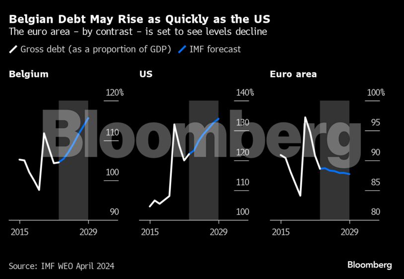 Όπως και οι ΗΠΑ, το χρέος του Βελγίου ως ποσοστό του ΑΕΠ υπερβαίνει ήδη το 100% και η αναλογία αυτή θα αυξηθεί κατά 10 ποσοστιαίες μονάδες και στις δύο χώρες μέχρι το 2029, σύμφωνα με το Διεθνές Νομισματικό Ταμείο.