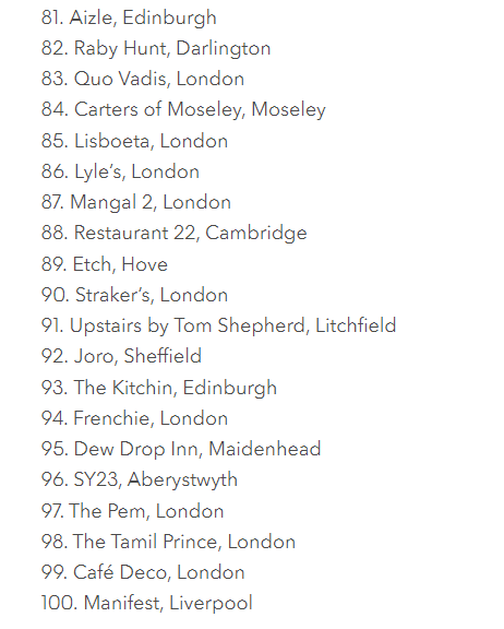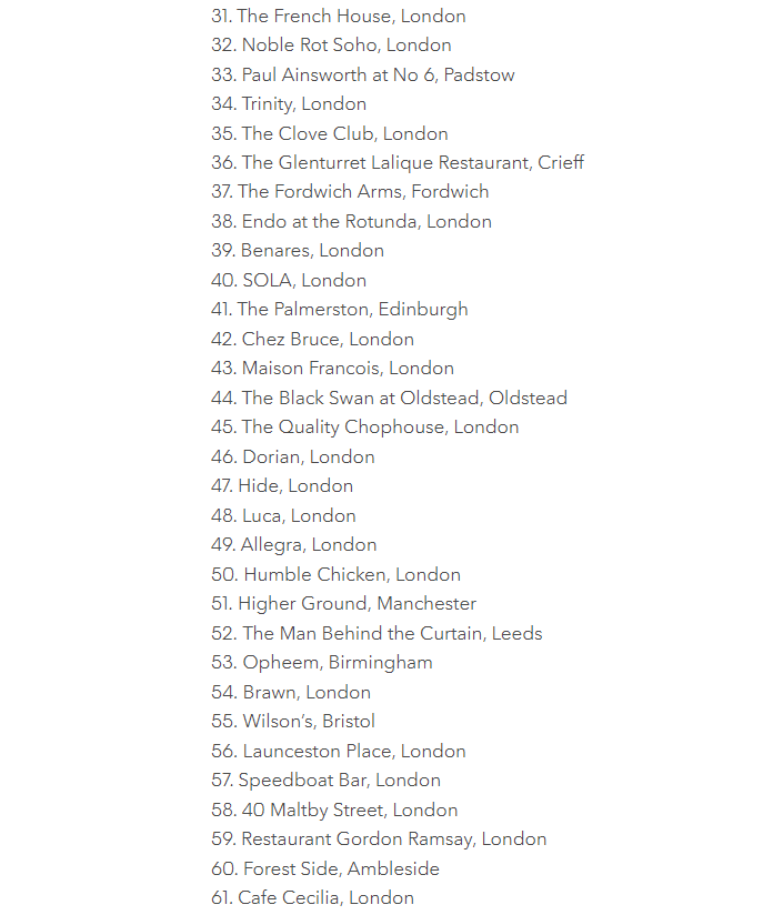 Μόνο δύο θέσεις στο top 10 προσφέρουν a la carte πιάτα που δεν αποτελούν μέρος ενός σετ μενού – το Bouchon Racine βρίσκεται στο Νο. 5 της λίστας και το Ritz στο Νο. 7. Τέλος, ένας από τους μεγάλους νικητές της φετινής χρονιάς αναδείχθηκε το Ledbury στο Notting Hill.