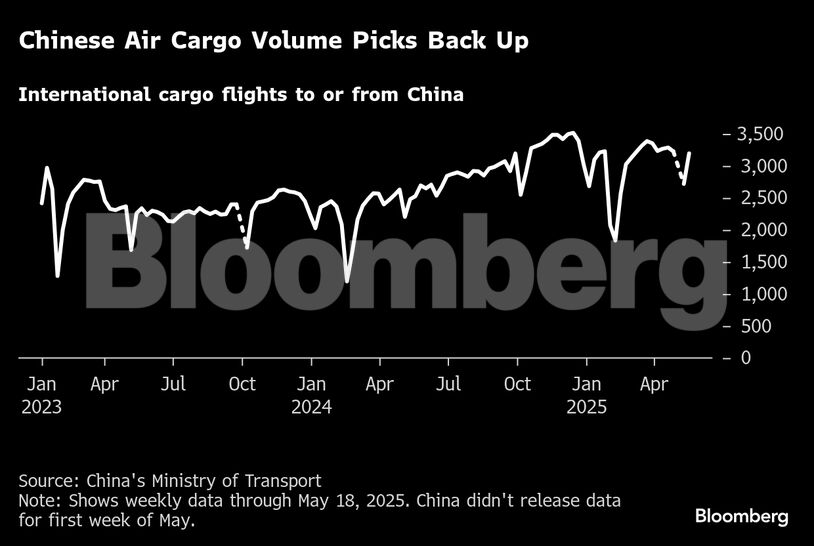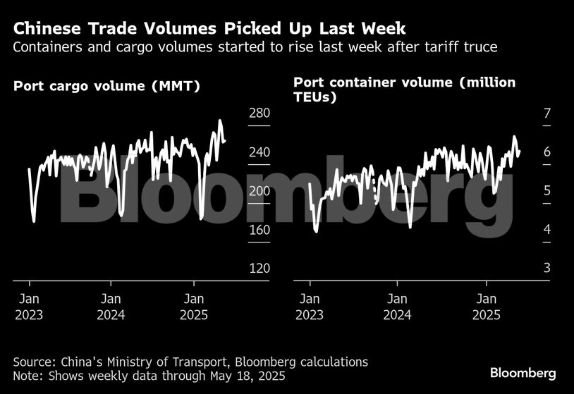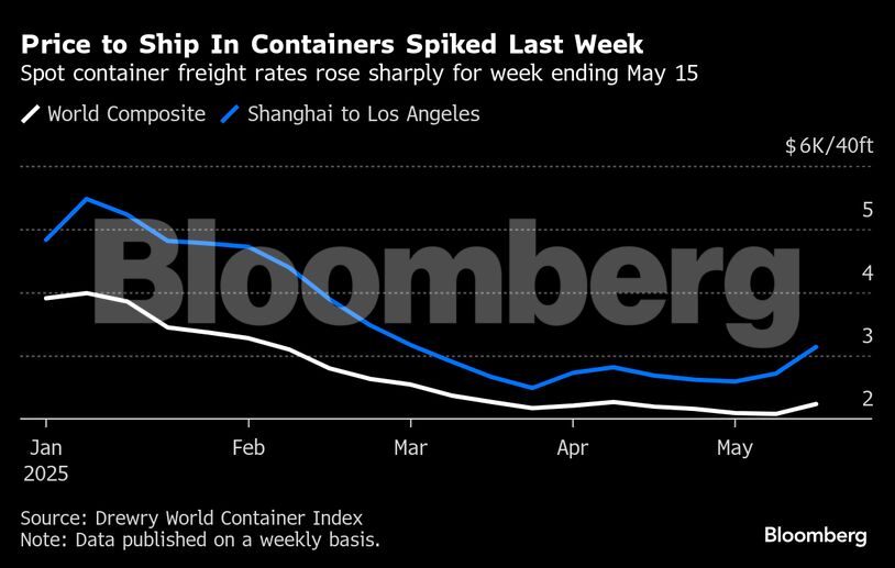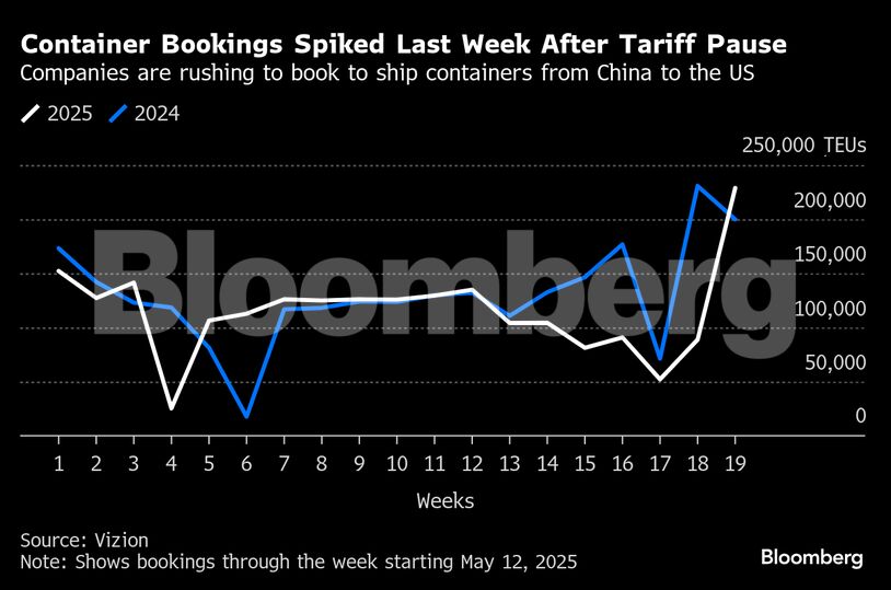 Την εβδομάδα που ξεκίνησε στις 12 Μαΐου, όταν οι ΗΠΑ και η Κίνα συμφώνησαν να μειώσουν δραστικά τους δασμούς για 90 ημέρες, οι κρατήσεις σε φορτηγά πλοία με προορισμό τις ακτές των ΗΠΑ υπερδιπλασιάστηκαν σε σχέση με την προηγούμενη, φτάνοντας τα 228.000 TEU, σύμφωνα με στοιχεία της πλατφόρμας παρακολούθησης εμπορευματοκιβωτίων Vizion και του παρόχου δεδομένων Dun & Bradstreet.