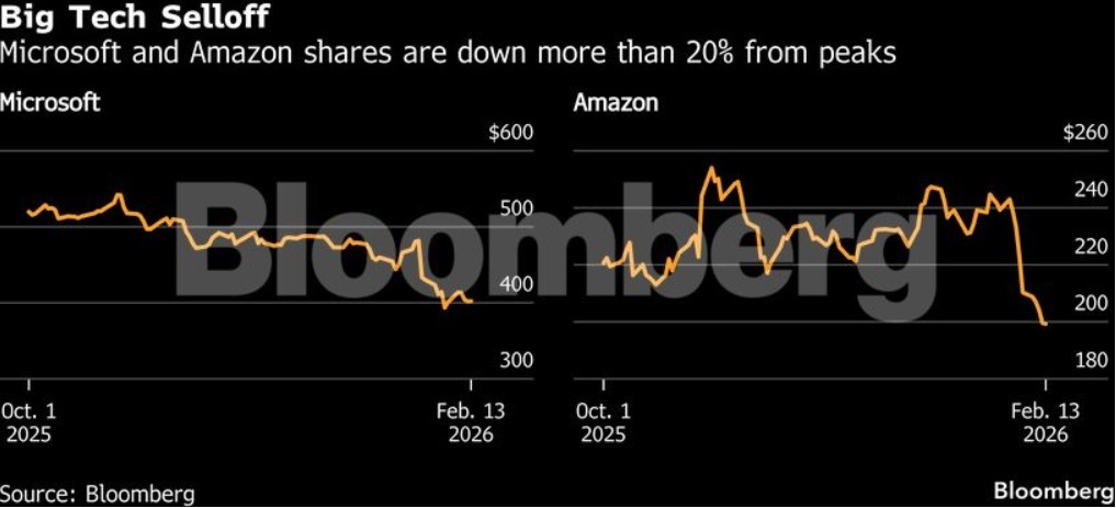 Από τότε που η Microsoft και η Meta εγκαινίασαν την περίοδο ανακοινώσεων αποτελεσμάτων τέταρτου τριμήνου στις 28 Ιανουαρίου, οι μετοχές της Microsoft και της Amazon έχουν υποχωρήσει περισσότερο από 16%, με την Amazon να καταγράφει το μεγαλύτερο σερί πτώσης των τελευταίων περίπου είκοσι ετών.