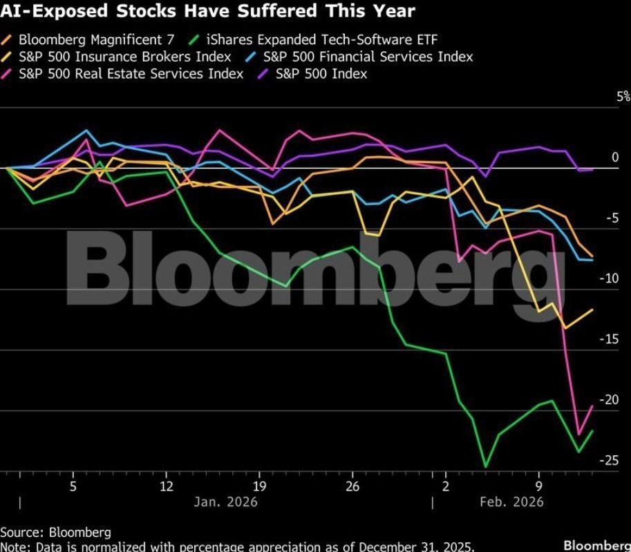 Το αποτέλεσμα ήταν μια σειρά από ισχυρές πτωτικές κινήσεις που έπληξαν δεκάδες εταιρείες σε πολλούς κλάδους — από τις υπηρεσίες ακινήτων και τη διαχείριση πλούτου έως τους ασφαλιστικούς μεσίτες και τις εταιρείες logistics — και εξαφάνισαν πάνω από 1 τρισ. δολάρια από τη χρηματιστηριακή αξία των μεγάλων τεχνολογικών εταιρειών που επενδύουν περισσότερο στην τεχνητή νοημοσύνη.