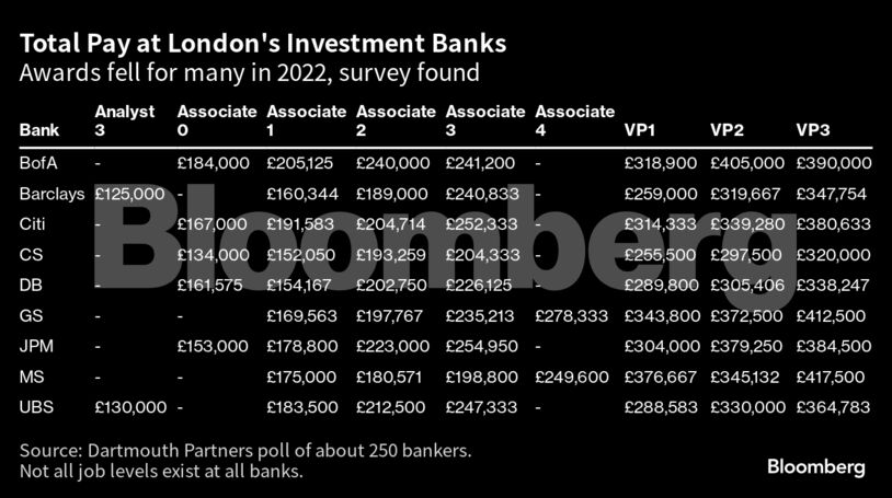 Τα πακέτα αποδοχών των τραπεζιτών στην Goldman Sachs Group Inc. του Λονδίνου η οποία αποτελούσε την επενδυτική τράπεζα με τους καλύτερους μισθούς το 2021, κατέγραψαν μείωση το 2022, με τους μισθούς των συνεργατών να μειώνονται κατά 28% και των αντιπροέδρων κατά 25%.