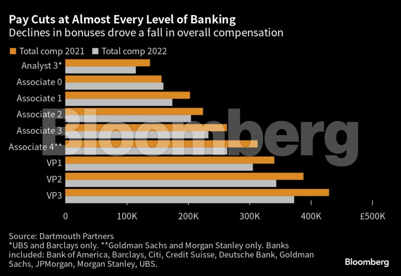 Τα πακέτα αποδοχών των τραπεζιτών στην Goldman Sachs Group Inc. του Λονδίνου η οποία αποτελούσε την επενδυτική τράπεζα με τους καλύτερους μισθούς το 2021, κατέγραψαν μείωση το 2022, με τους μισθούς των συνεργατών να μειώνονται κατά 28% και των αντιπροέδρων κατά 25%.
