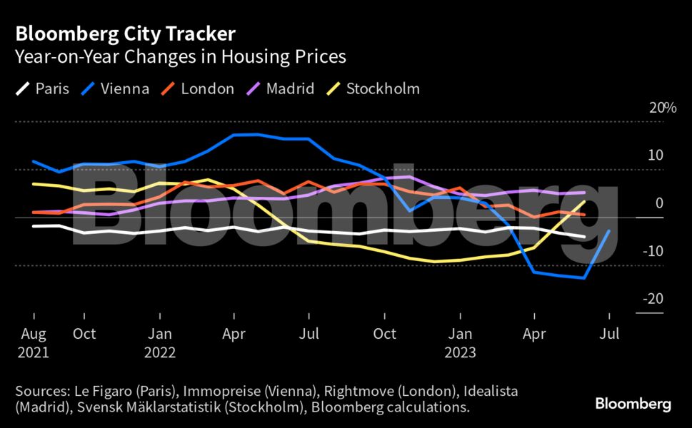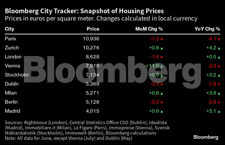 Στη Βιέννη, οι τιμές ήταν χαμηλότερες κατά 2,9% σε σχέση με έναν χρόνο πριν έναντι μειώσεων πάνω από 12% τους δύο προηγούμενους μήνες. Σε άλλες πόλεις, ωστόσο, η έλλειψη ακινήτων συντηρεί την ανοδική πίεση στις τιμές, όπως στη Μαδρίτη, όπου αυξήθηκαν 5,1% τον Ιούνιο.