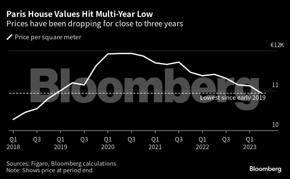 Όπως σημειώνει το Bloomberg, τον Ιούνιο οι τιμές μειώθηκαν κατά 4,1% σε ετήσια βάση, υποχωρώντας στα 10.936 ευρώ ανά τετραγωνικό μέτρο, το χαμηλότερο επίπεδο από τον Ιανουάριο του 2019 – σύμφωνα με στοιχεία που συγκεντρώνει η εφημερίδα Figaro.