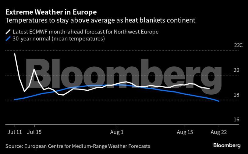 Ο καύσωνας θα συνεχιστεί στο μεγαλύτερο μέρος της Μεσογείου και την επόμενη εβδομάδα, ενώ οι υψηλές θερμοκρασίες στη νότια Γερμανία και στις Άλπεις θα συνεχίζουν να πιέζουν το Ρήνο.