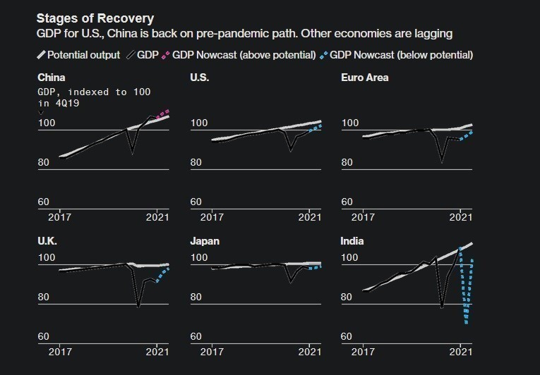 «Οι υπολογισμοί μας δεν μπορούν να προβλέψουν τι θα συμβεί στο μέλλον, ενώ η παρουσία της μετάλλαξης Δέλτα μπορεί να αλλάξει τα δεδομένα απότομα και ριζικά», ανέφεραν οι Bjorn Van Roye και Τom Orlik του Bloomberg Economics. «Προς το παρόν, όμως, τα στοιχεία υποδεικνύουν θετικές τάσεις το τρίτο τρίμηνο μέσω της επιτάχυνσης της παγκόσμιας ανάκαμψης και του περιορισμού των αυξητικών τάσεων του πληθωρισμού».