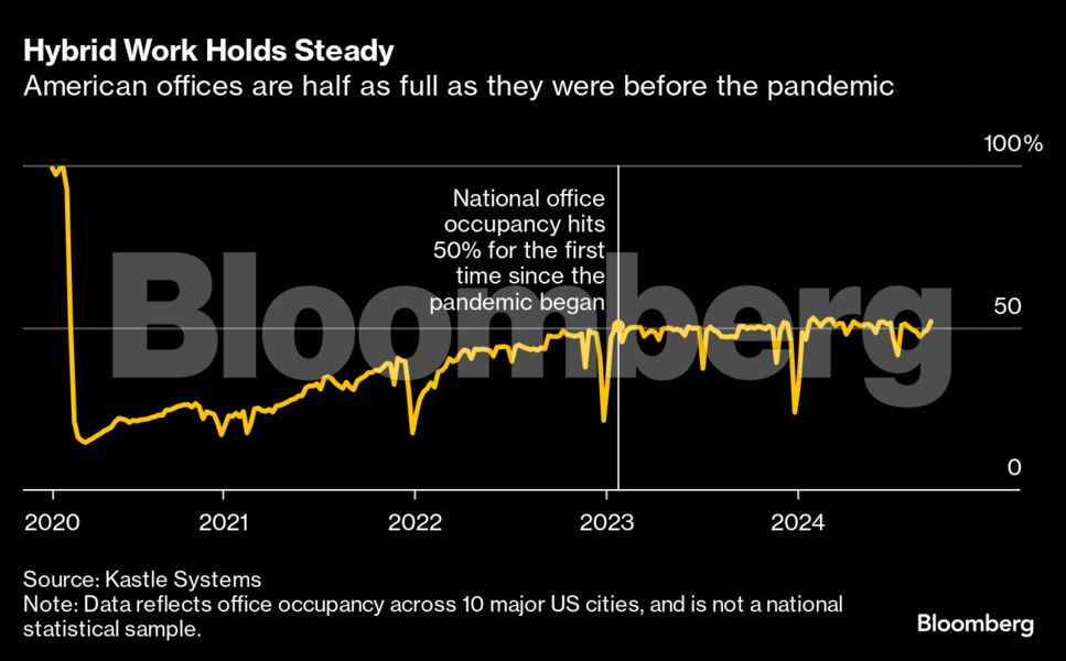 Ακόμα κι έτσι, ο χρόνος που οι εργαζόμενοι εργάζονται σε γραφεία δεν έχει αυξηθεί τόσο πολύ από τις αρχές του περασμένου έτους. Τα γραφεία σε όλες τις ΗΠΑ εξακολουθούν να είναι μόνο κατά το ήμισυ γεμάτα από ό,τι ήταν πριν από την πανδημία, σύμφωνα με τα στοιχεία για την παραλαβή των καρτών από την εταιρεία ασφαλείας Kastle Systems. Στις ΗΠΑ, οι άνθρωποι εργάζονταν εξ αποστάσεως περίπου μία ή δύο ημέρες το μήνα πριν από το 2020, σύμφωνα με στοιχεία από το Γραφείο Στατιστικής Εργασίας των ΗΠΑ.