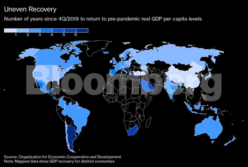 Σε χώρες όπως η Αργεντινή και η Ισπανία, θα πάρει τρία χρόνια για την επιστροφή στο προ-πανδημίας κατά κεφαλήν ΑΕΠ, σύμφωνα με τα στοιχεία. Ο διπλάσιος χρόνος σε σχέση με τις ΗΠΑ και την Κίνα.