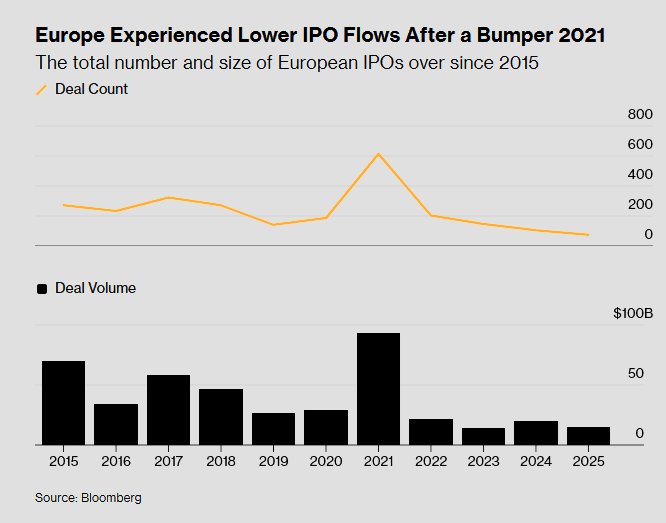 Από το 2021, που ήταν μια εξαιρετικά καλή χρονιά για τις αρχικές δημόσιες προσφορές, παρατηρείται παρατεταμένη έλλειψη IPO στην Ευρώπη. Τα επόμενα χρόνια υπήρξε σποραδική δραστηριότητα, αλλά ο πόλεμος στην Ουκρανία, η άνοδος των επιτοκίων, η ραγδαία αύξηση των τιμών της ενέργειας, οι συγκρούσεις στη Μέση Ανατολή, το εσωτερικό πολιτικό χάος, οι δασμοί και οι εμπορικοί πόλεμοι προκάλεσαν αβεβαιότητα που καθιστά δύσκολη την πραγματοποίηση IPO. Αυτές οι ανησυχίες αρχίζουν να υποχωρούν και οι τραπεζίτες που προσβλέπουν στο επόμενο έτος υποστηρίζουν ότι οι θετικές προοπτικές φαίνονται σαφείς.