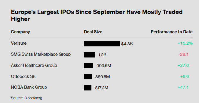 Κεντρικό ρόλο σε αυτή την αλλαγή έπαιξαν οι εταιρείες που εισήχθησαν στο χρηματιστήριο τον Σεπτέμβριο και τον Οκτώβριο. Η εταιρεία οικιακής ασφάλειας Verisure Plc πραγματοποίησε την μεγαλύτερη IPO στην περιοχή από το 2022, ακολουθούμενη από την εταιρεία καταναλωτικών δανείων Noba Bank Group AB και τον κατασκευαστή προσθετικών μελών Ottobock SE. Αυτές οι εταιρείες οδήγησαν σε ανάκαμψη του όγκου των εκδόσεων και διαπραγματεύτηκαν σε υψηλότερες τιμές από την αρχική τιμή τους τις εβδομάδες που ακολούθησαν.
