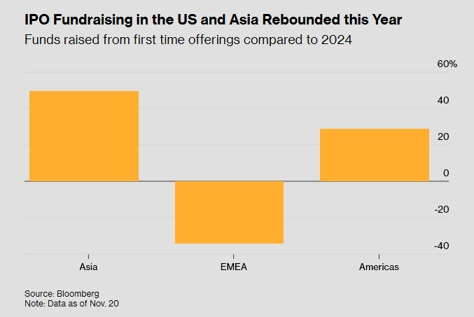 Συνολικά, τα χρηματιστήρια της περιοχής EMEA έχουν συγκεντρώσει περισσότερα από 21 δισεκατομμύρια δολάρια μέσω IPO μέχρι στιγμής φέτος, ανακάμπτοντας από το α’ εξάμηνο αλλά εξακολουθούν να είναι 34% χαμηλότερα από το 2024, σύμφωνα με στοιχεία που συγκέντρωσε το Bloomberg. Αυτό έρχεται σε αντίθεση με τα χρηματιστήρια στις ΗΠΑ και την υπόλοιπη Ασία, τα οποία συγκέντρωσαν περισσότερα σε IPO σε σχέση με πέρυσι.