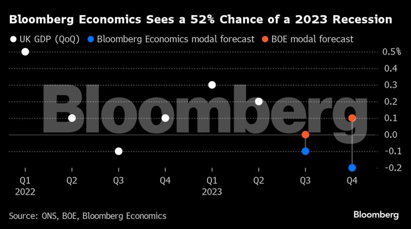 Το υπόδειγμα του Bloomberg Economics – το οποίο έχει ήδη στις προβλέψεις του μια ήπια ύφεση – υποδηλώνει 70% πιθανότητα συρρίκνωσης το τρίτο τρίμηνο μετά την πτώση του ΑΕΠ κατά 0,6% τον Ιούλιο και τη μερική μόνο ανάκαμψη τον Αύγουστο. Η Τράπεζα της Αγγλίας εκτίμησε την περασμένη εβδομάδα ότι η πιθανότητα ύφεσης κατά την περίοδο των προβλέψεών της είναι 50%.