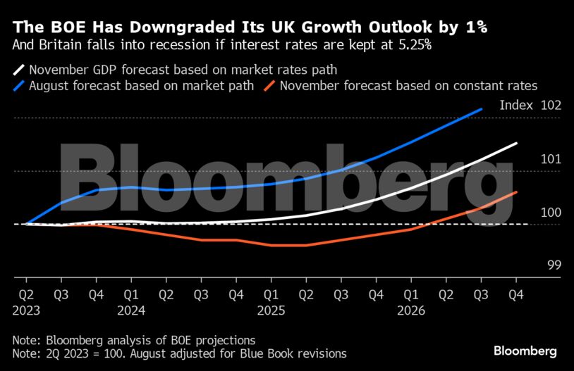 Οι οικονομολόγοι έχουν προβλέψει ότι το ΑΕΠ θα υποχωρήσει κατά 0,1% τους τρεις μήνες έως τον Σεπτέμβριο, σύμφωνα με έρευνα του Bloomberg που πραγματοποιήθηκε το απόγευμα της Παρασκευής. Η BοE αναμένει ότι η ανεργία, που σήμερα είναι 4,3%, θα αυξηθεί στο 5,1% έως το 2026.
