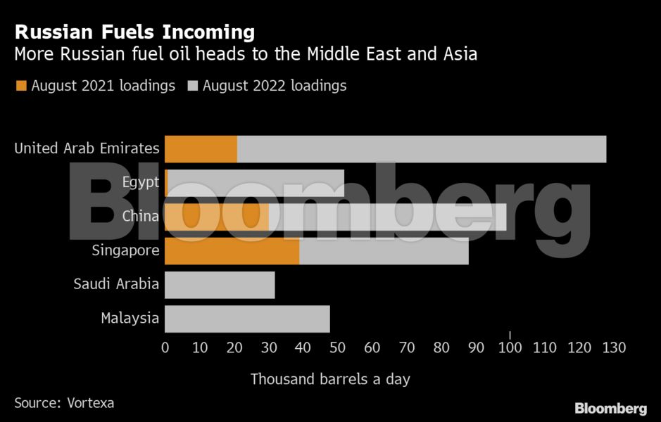 Τα δεδομένα παρακολούθησης πλοίων από τη Vortexa Ltd. δείχνουν μια σημαντική αύξηση στις φορτώσεις ρωσικού μαζούτ με προορισμούς στη Μέση Ανατολή και στην Ασία. Τα φορτία με προορισμό τα Ηνωμένα Αραβικά Εμιράτα αυξήθηκαν σχεδόν πέντε φορές τον περασμένο μήνα σε σύγκριση με ένα χρόνο πριν, ενώ εκείνα με προορισμό τη Σιγκαπούρη αυξήθηκαν κατά 25%. Οι αποστολές για την Αίγυπτο, την Κίνα, τη Σαουδική Αραβία και τη Μαλαισία έχουν επίσης αυξηθεί κατακόρυφα.