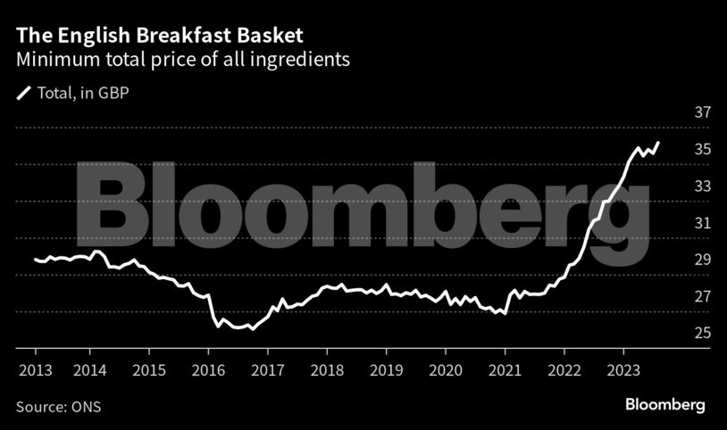 Το συνολικό κόστος όλων των συστατικών ενός fry-up αυξήθηκε κατά 57 πένες στις 36,15 λίρες (44,81 δολάρια) τον Αύγουστο. Ο μηνιαίος δείκτης Breakfast Index του Bloomberg χρησιμοποιεί μεγέθη προϊόντων που παρέχονται από την Εθνική Στατιστική Υπηρεσία για να αναλύσει τις τιμές των λουκάνικων, του μπέικον, των αυγών, του ψωμιού, του βουτύρου, της ντομάτας, των μανιταριών, του γάλακτος, του τσαγιού και του καφέ.