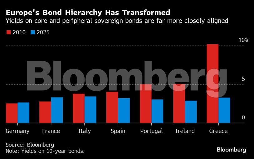 Τα ισπανικά, ελληνικά και πορτογαλικά ομόλογα έχουν πλέον χαμηλότερες αποδόσεις από τα γαλλικά. Η Ιταλία βρίσκεται σε πορεία να ξεπεράσει τη Γερμανία και τη Γαλλία για τέταρτη συνεχή χρονιά σε όρους συνολικών αποδόσεων, ισοφαρίζοντας τη μακροβιότερη σειρά νικών που έχει καταγραφεί ποτέ.
